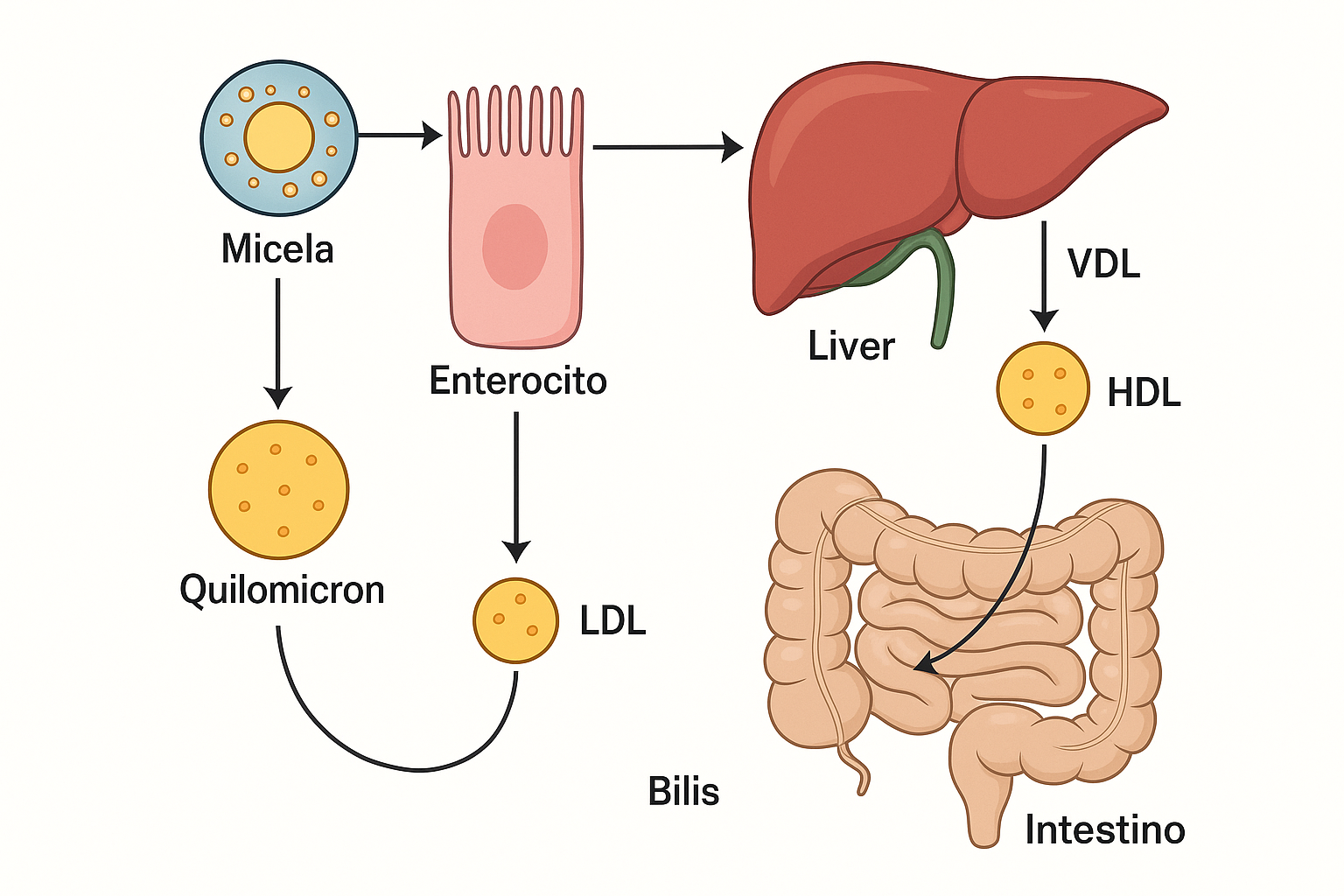 micela → enterocito → quilomicrón → hígado → LDL/HDL → excreción biliar