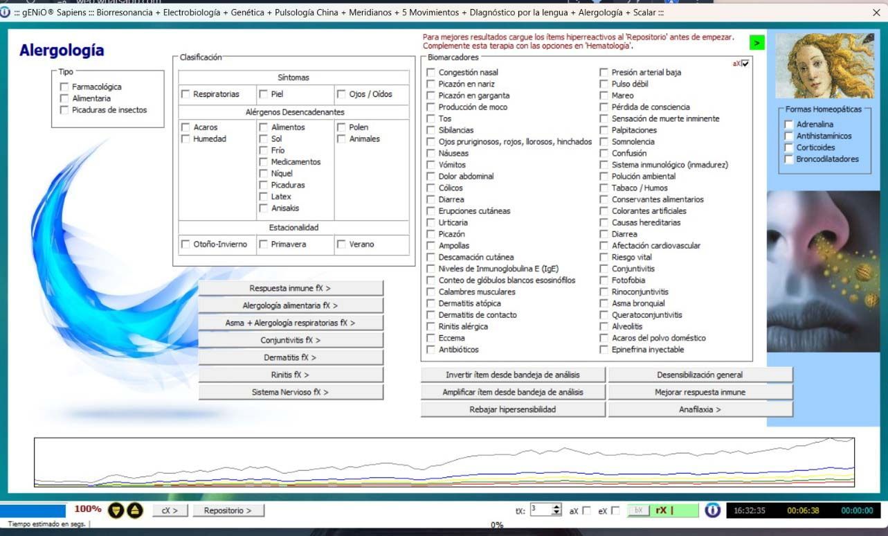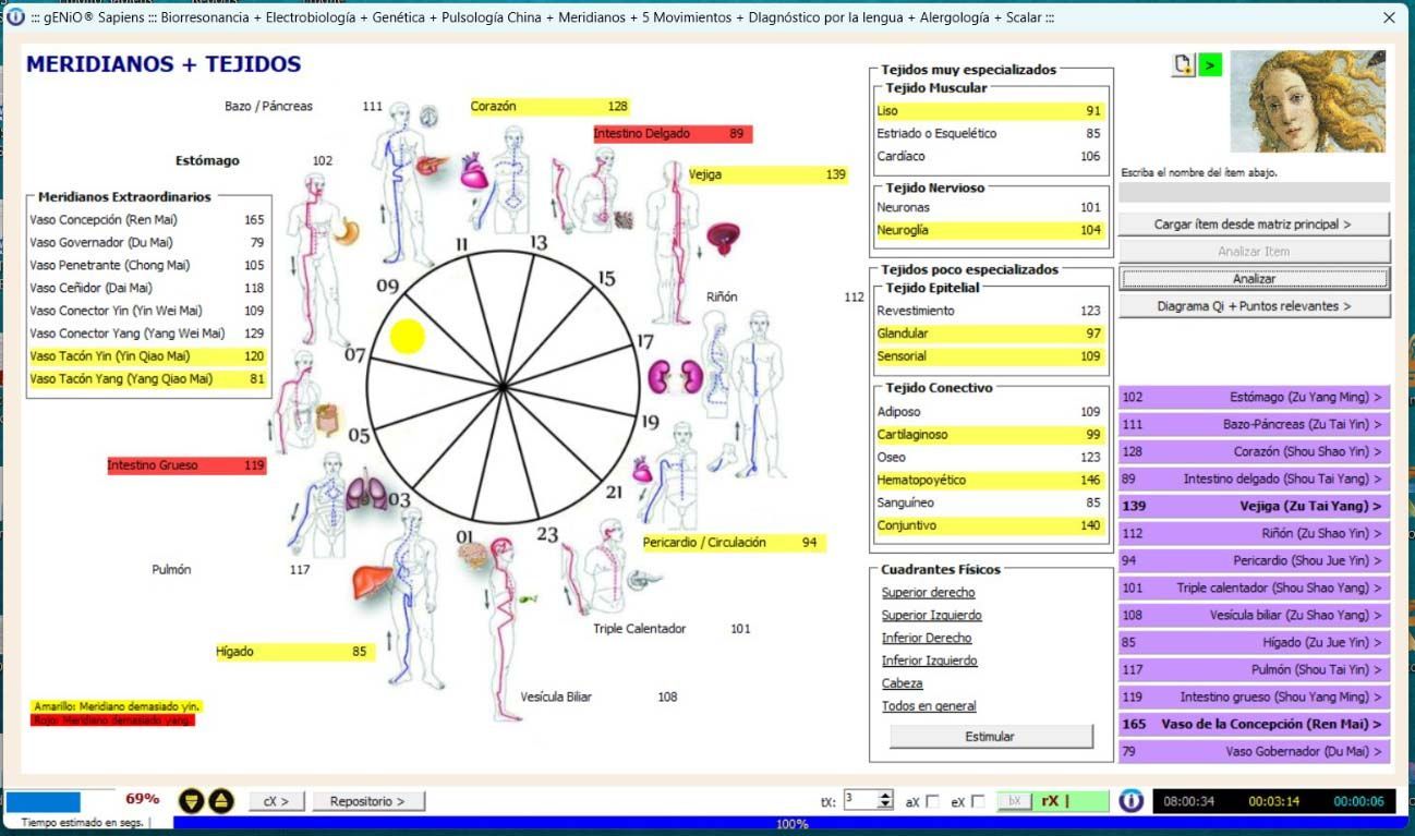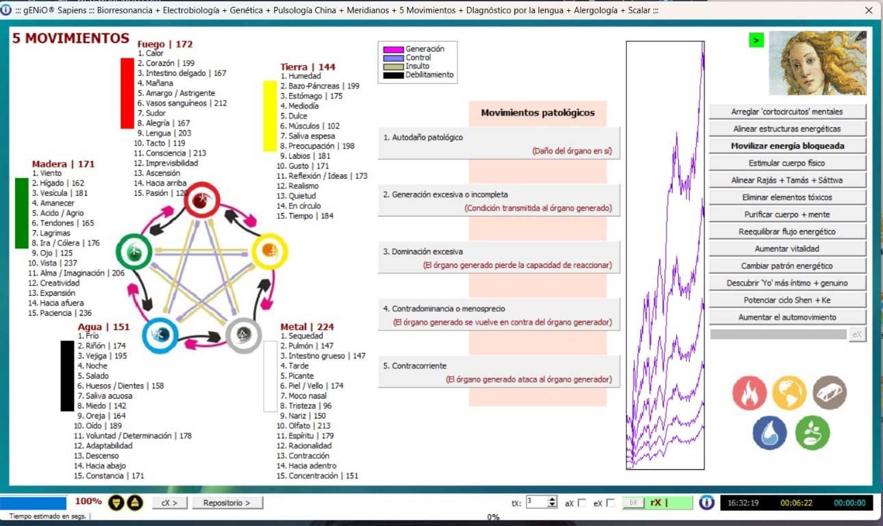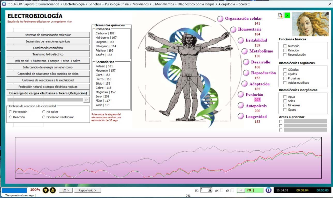 Permite observar el impacto de elementos químicos, biomoléculas, ciclos energéticos y funciones celulares en la salud y aplicar protocolos de corrección mediante frecuencias bioeléctricas.