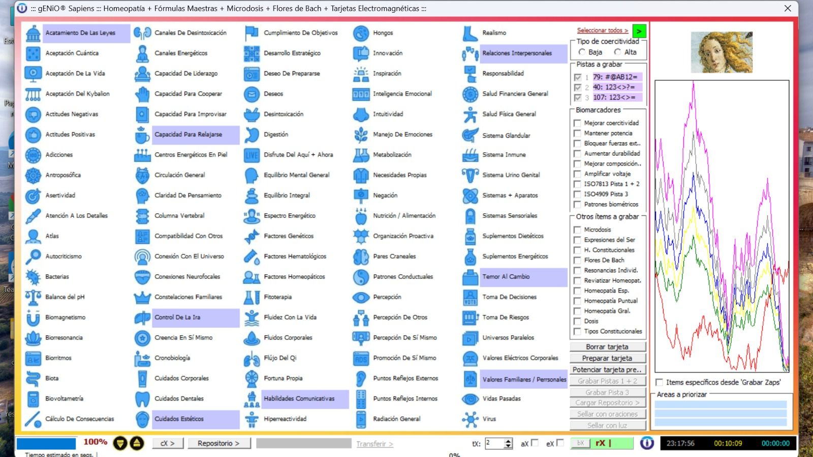 Se pueden seleccionar remedios de una lista (con indicaciones y usos descritos) y cargarlos en el sistema para generar la estimulación cuántica correspondiente.