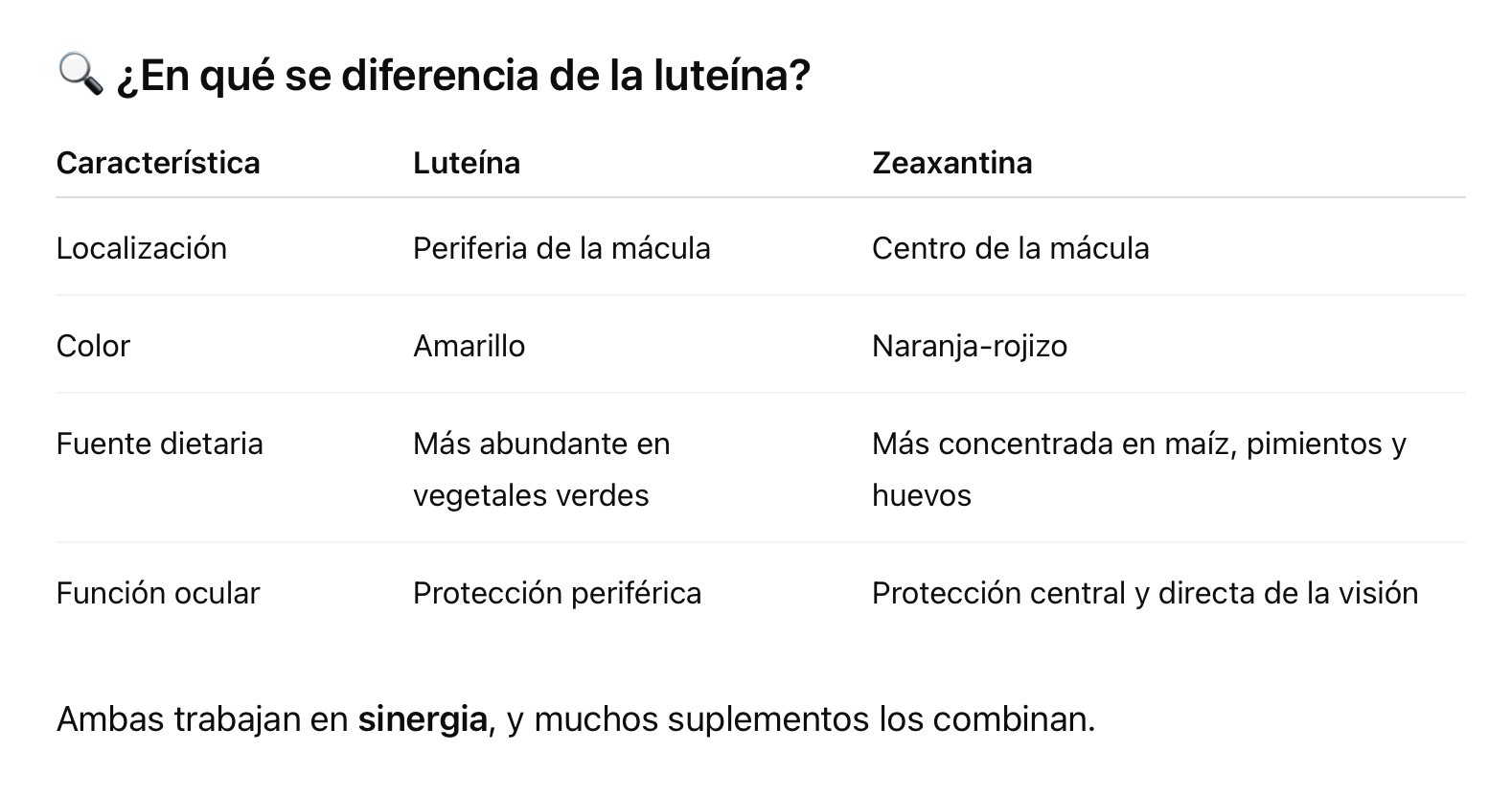 La zeaxantina es un carotenoide natural, muy parecido a la luteína, que se encuentra en frutas, vegetales y en concentraciones altas en el ojo humano, especialmente en la mácula, una zona clave de la retina.
